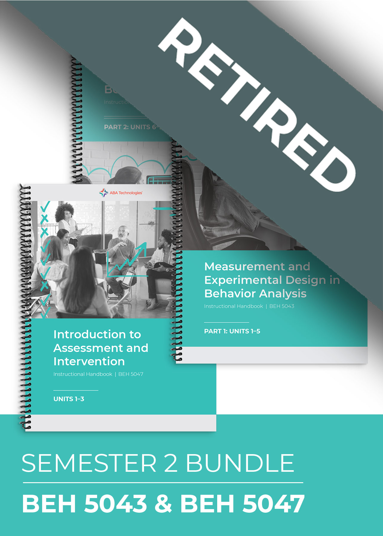 Image Semester 2 Bundle Price $107.47 5th Edition has been Retired. RETIRED Products Included in this Bundle: BEH 5043: Measurement and Experimental Design in Behavior Analysis Part 1 BEH 5043: Measurement and Experimental Design in Behavior Analysis Part 2 BEH 5047: Introduction to Assessment and Intervention Category: ABA Online Program, 5th Edition Handbooks YOU MAY ALSO LIKE... Semester 4 Bundle$107.47More Info Add to cart Semester 5 Bundle$107.47More Info Add to cart