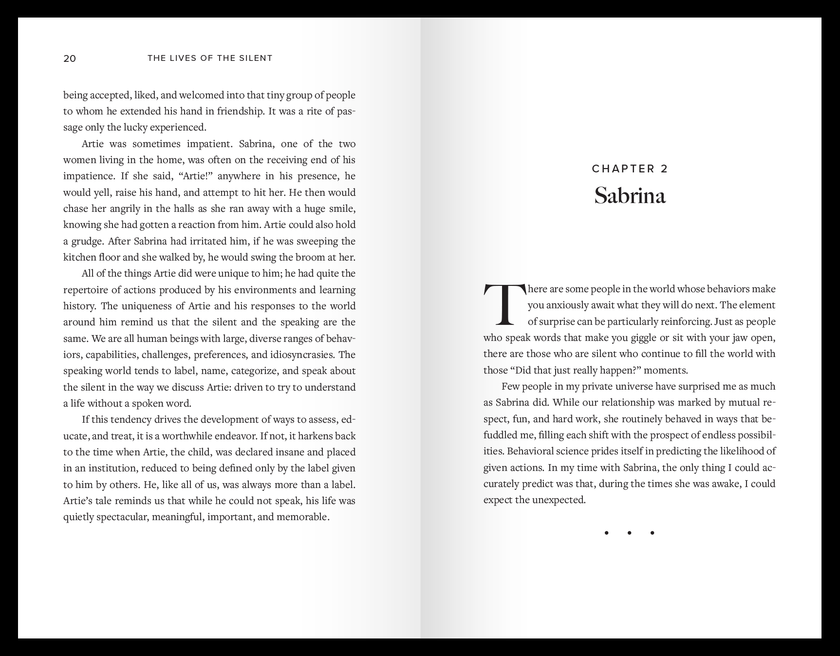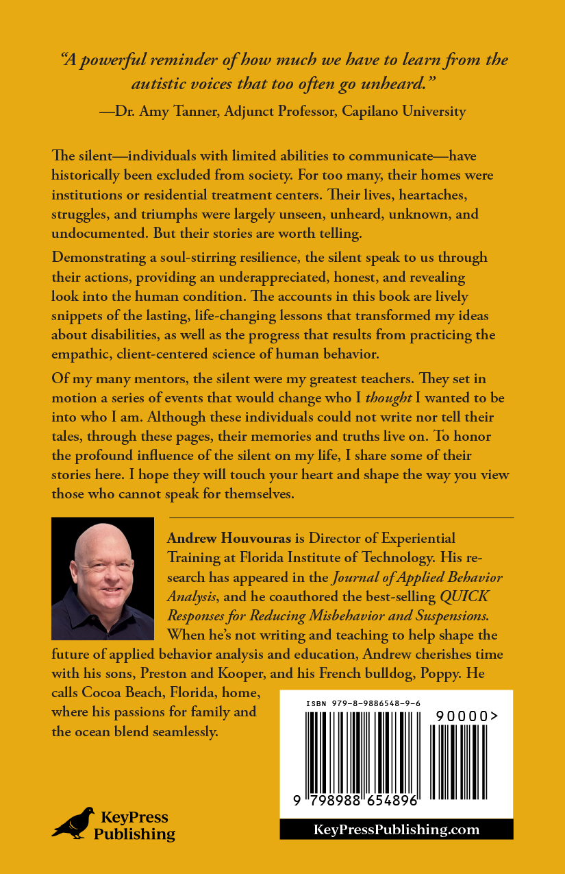 Demonstrating a soul-stirring resilience, the silent speak to us through their actions, providing an underappreciated, honest, and revealing look into the human condition. The accounts in this book are lively snippets of the lasting, life-changing lessons that transformed my ideas about disabilities, as well as the progress that results from practicing the empathic, client-centered science of human behavior.
