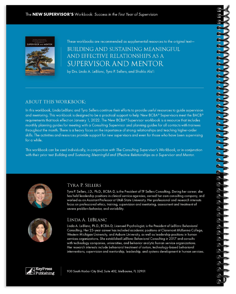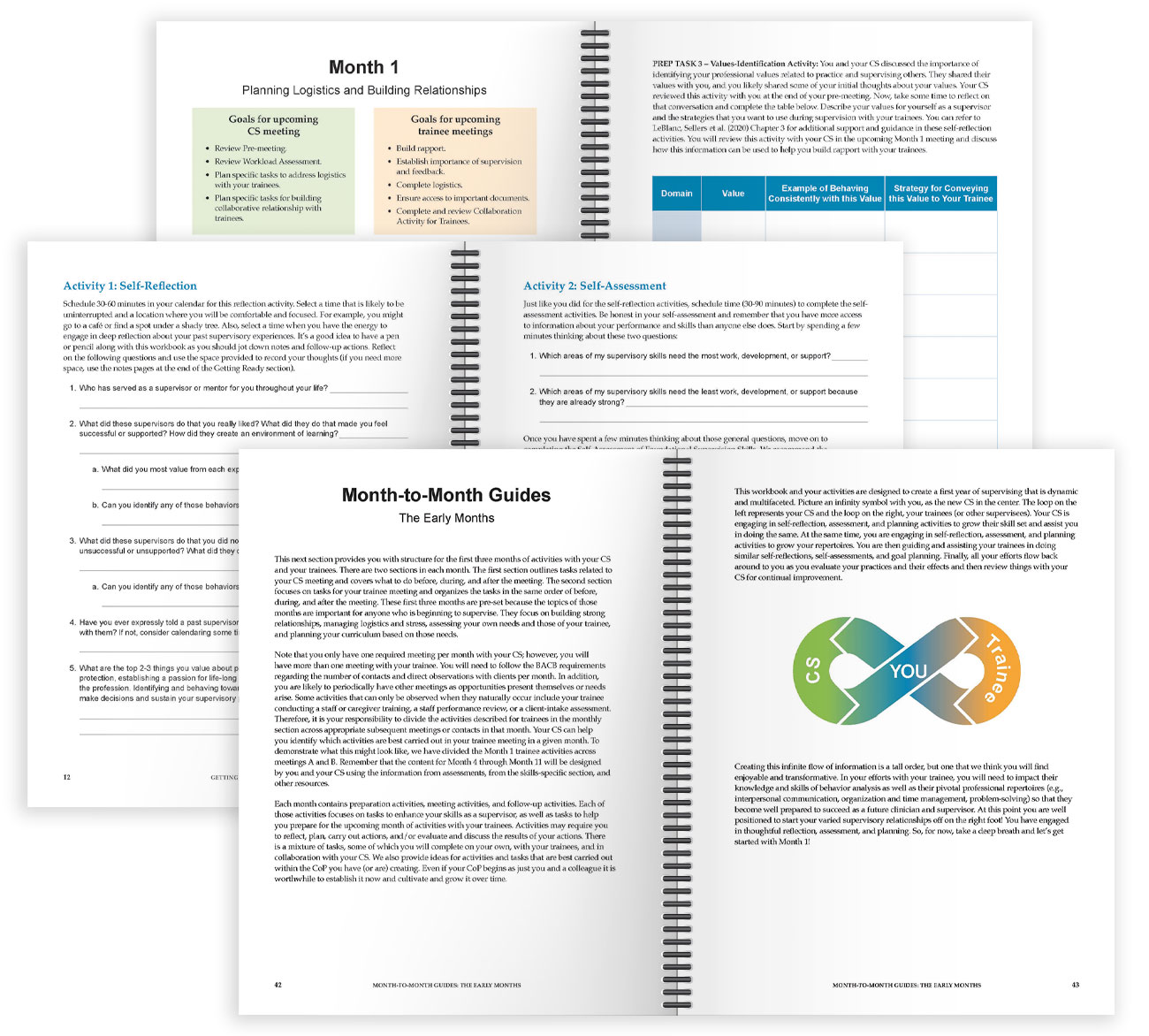 This workbook is designed to be a practical support to help New BCBA® Supervisors meet the BACB® requirements that took effect on January 1, 2022. The New BCBA® Supervisor workbook is a resource that includes monthly planning guides for meeting with a Consulting Supervisor and planning guides for all contacts with trainees throughout the month.
