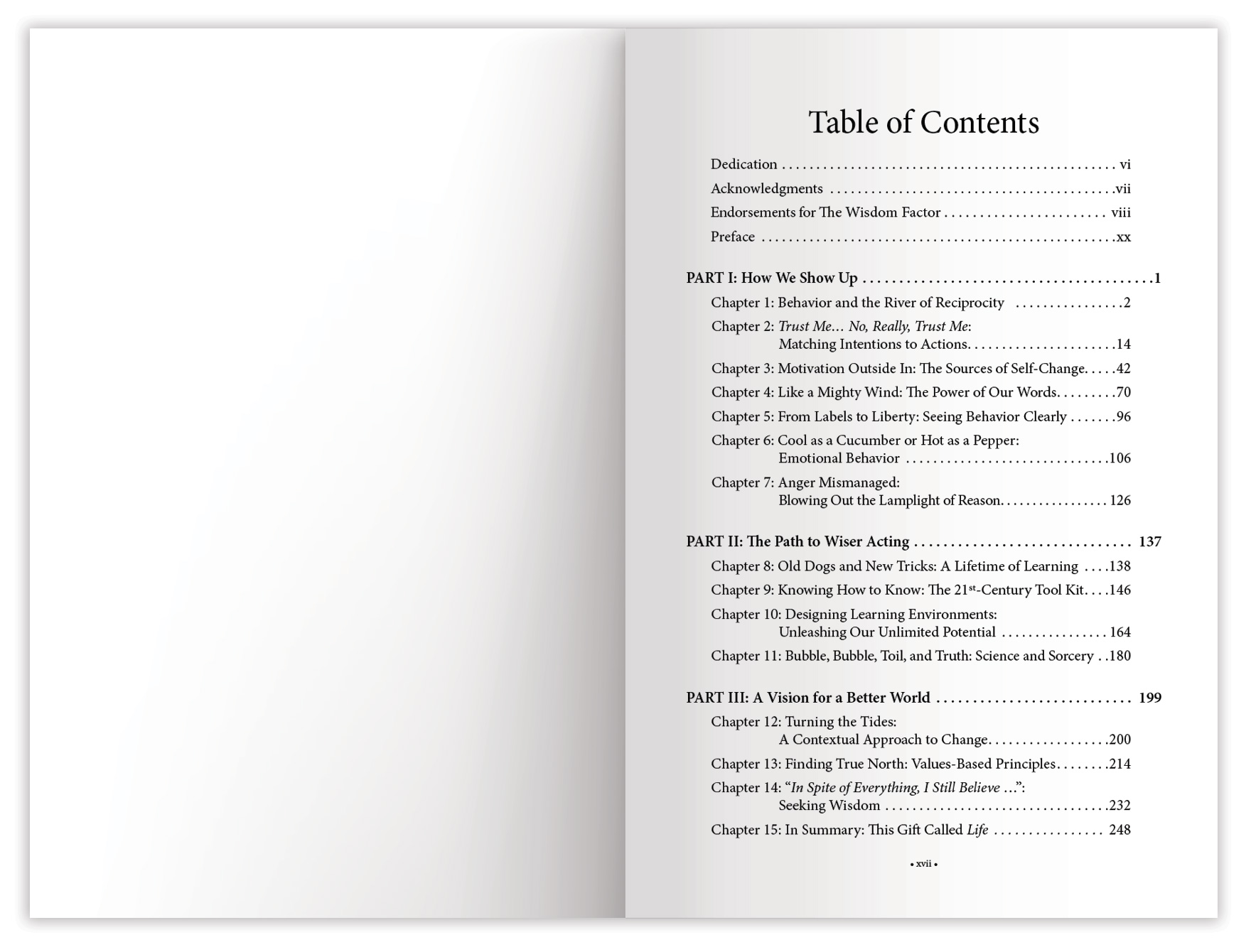 The Wisdom Factor is about how you show up, what you say and do, and the legacy you leave. Using science and experience, the authors describe how a river of reciprocity connects us. Individual behavior holds the transformational power to create change, even in tough times. Assessing your effects by your actions is at the heart of this book. The strategies can help you build a better world. Watch the ripple effect.