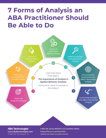 7 Forms of Analysis an ABA Practitioner Should Be Able to Do Learn more about these steps in The Importance of Analysis on Applied Behavior Analysis, a CE by Henry "Hank" D. Schlinger Jr., Ph.D., BCBA-D Download Infographic PDF Learn More